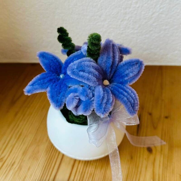 Keramikgips-Vase, verziert mit zarten, handgefertigten Blümchen aus Pfeifenreinigern (Chenilledraht)