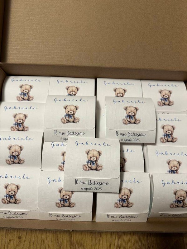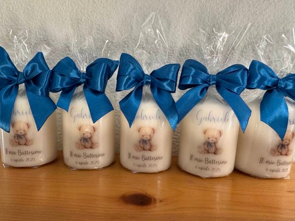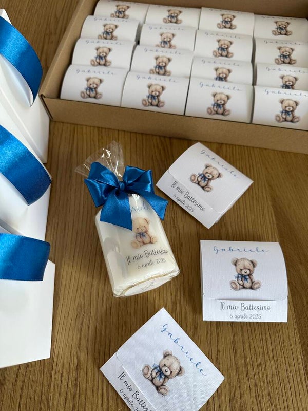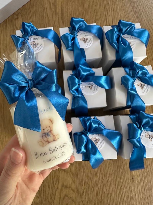 Candela confezionata + scatola con fiocco, tag personalizzato e nome invitato (come in foto) 13.-