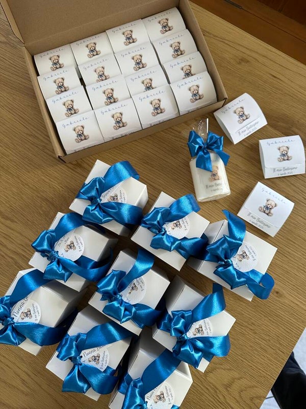 Bomboniera composta da candela personalizzata confezionata con carta regalo trasparente e nastro in raso, inserita in un'elegante scatolina bianca anch'essa chiusa con fiocco in raso, tag e bigliettino e portaconfetti abbinato.