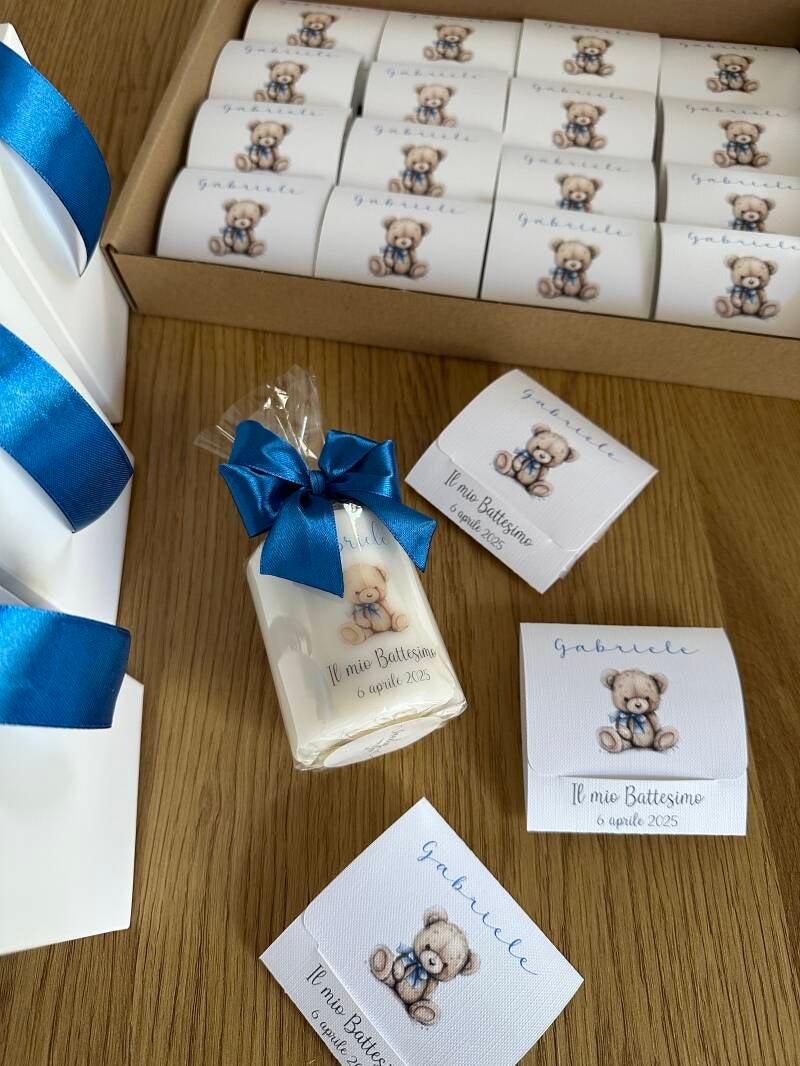 Bomboniera composta da candela personalizzata confezionata con carta regalo trasparente e nastro in raso, inserita in un'elegante scatolina bianca anch'essa chiusa con fiocco in raso, tag e bigliettino e portaconfetti abbinato.